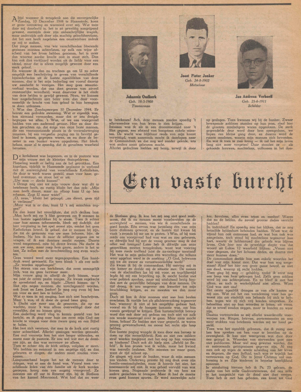 Daarna hebben we opnieuw met elkaar God om Zijn kracht gevraagd, en Hem gebeden om in een sterk geloof te mogen leven uit de beloften, die Hij ons gegeven had. En toen kwam het hoogtepunt. 't Was alsof hier in deze donkere bunker de aarde door de hemel werd aangeraakt. God maakte hen hoe langer hoe meer klaar voor het einde. Want hoewel de wacht al onrustig begon te worden, en de dreunende laars reeds vlakbij gehoord werd, toch stelden ze voor om tenslotte nog met elkaar te zingen. En we voelden het: daarvoor moest alles wijken! Als God zó sterk werkt, zijn er dan nog belemmeringen? Zelfs de wacht schijnt dat enigermate beseft te hebben, want hij trok zich weer terug. En toen hebben we daar, op hun eigen aanwijzing, met elkaar ons geloofsvertrouwen beleden in het machtige Lutherlied; "Een vaste burcht is onze God, een toevlucht voor de Zijnen".