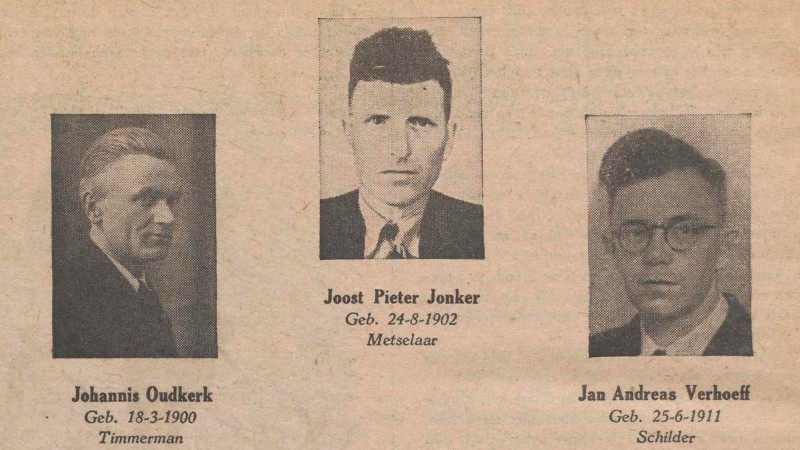 Het storen van een kerkdienst, dat eerst onmogelijk leek, was nu geen bezwaar meer. Mijn vrouw ging in allerijl de kerk binnen, waar we juist de eerste psalm zongen. Ze kwam regelrecht de spreekstoel op, en hijgde: "Direct komen; op 't Slot zijn negen mannen, die terechtgesteld worden, ook Joost en Leen Jonker! Je mag nog even bij hen om voor en met hen te bidden." Wat er toen in mij omging, laat zich niet beschrijven. Maar 't was, of ik door de grond heen ging. 'k Dacht niet meer aan de gemeente, die op me wachtte, maar 'k was alleen overweldigd door dat vreeslijke, dat nu komen ging. Een ouderling werd vlug in kennis gesteld van het bericht, en ik ging naar huis om eerst mijn God om kracht te vragen voor deze zware gang en een Bijbel te halen.