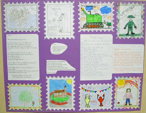 5. Op het podium stonden grote borden met tekeningen en gedichten.