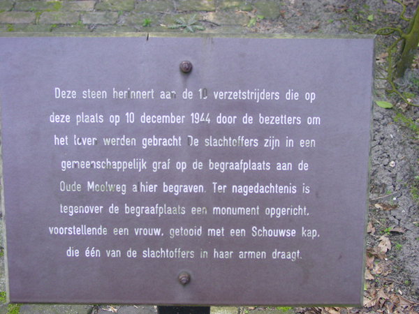 Een steen op die locatie markeert de plek waar 65 jaar geleden op zondag 10 december 1944 tien inwoners van Schouwen-Duiveland door de Duitse bezetters werden opgehangen. Het waren tien mannen, actief in het verzet, die door een dramatische samenloop van omstandigheden, werden opgepakt. Kinderen van openbare basisschool 't Staepel'of noemden hun namen tijdens de druk bezochte herdenkingsbijeenkomst in de Jacobuskerk: Menke Koos van der Beek, Iman Marinus van der Bijl, Willem Maarten Boot, Marcus Pieter Machiel van der Klooster, Joost Pieter Jonker, Leendert Marie Jonker, Cornelis Lazonder, Johannis Oudkerk, Adriaan Martijn Padmos en Jan Andreas Verhoeff.