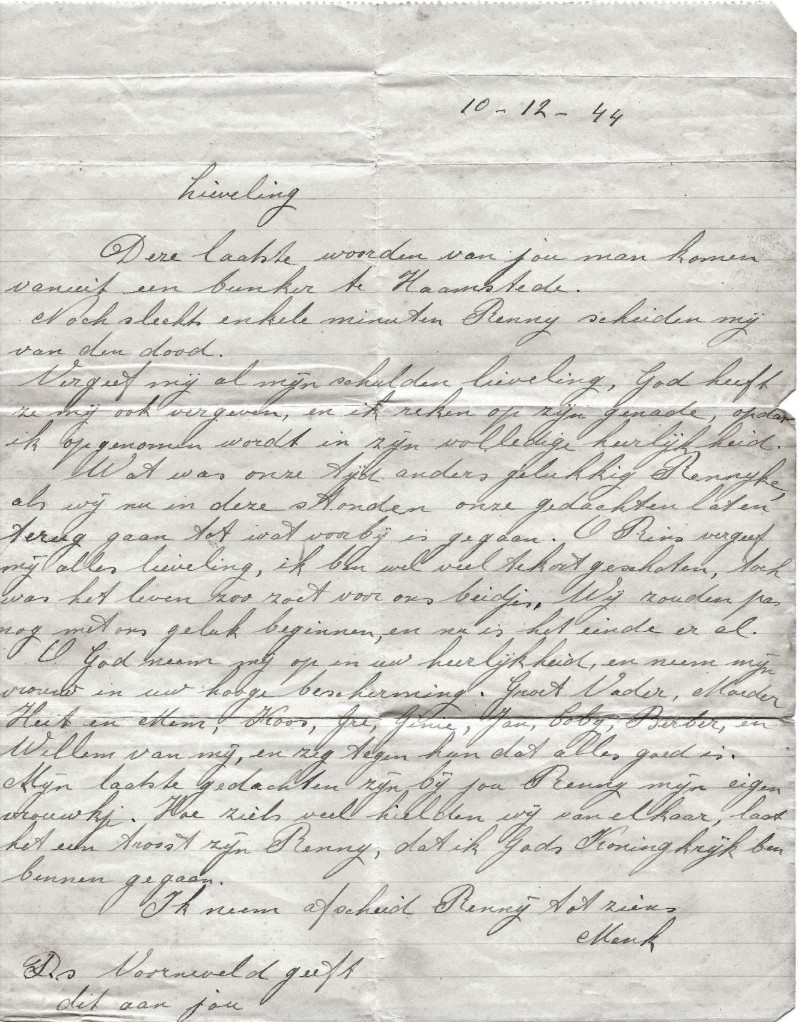 Hier volgt een fotokopie van de afscheidsbrief van Menke van de Beek aan zijn geliefde Renny.