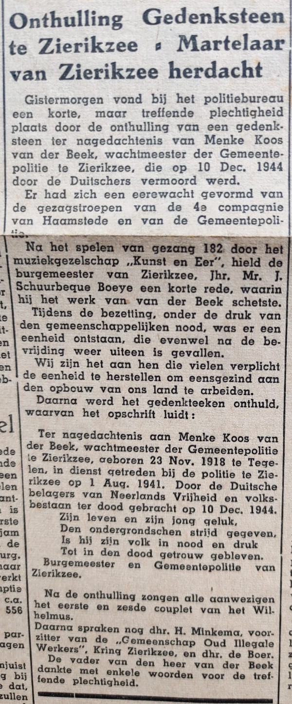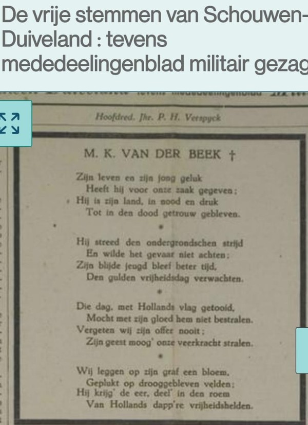 Menke van der Beek was een veelzijdig verzetsman. Hij hield zich vanuit Zierikzee ondermeer bezig met het uitgeven van een illegale krant "De VRIJE STEMMEN". Op 7 november 1944 maakte hij een Vrijheidsnummer van 1000 exemplaren in de kleuren rood, wit blauw en oranje. Het duurde echter tot mei 1945 voor Schouwen en Duiveland werd bevrijd. Een maand na het stencilen van het Vrijheidsnummer werd Menke opgehangen met negen anderen.