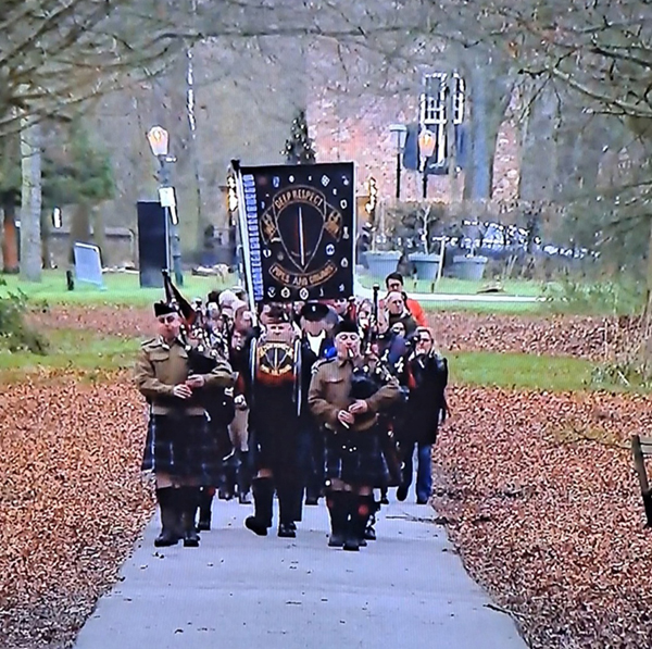 Een groot pipercorps begeleidde de stoet van nabestaanden.