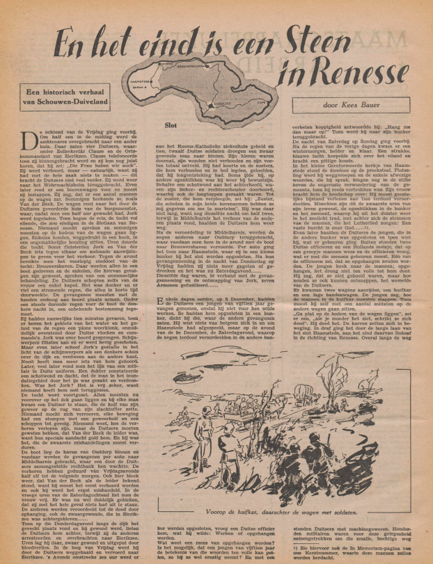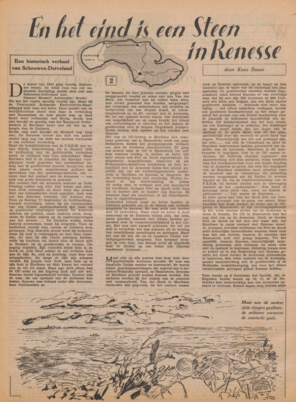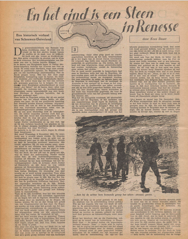 Het verhaal 'En het eind is een steen in Renesse' is geschreven door Kees Bauer. Hij heeft als journalist vrij kort na de oorlog een aantal boeken en verhalen geschreven over bijzondere gebeurtenissen, zoals de ontsnapping uit de bunker van kamp Amersfoort. Ook een groot artikel in Het Grote Gebod deel 2 over KP Utrecht en Betuwe. Hij was voorheen adjunct-hoofdredacteur van Elseviers Weekblad van 1959-1965. Van 1968-1978 was hij hoofdredacteur van het weekblad Accent. Uit dat blad leest u het grondige artikel van Lars Anderson uit 1969 in hoofdstuk 11.