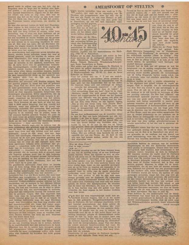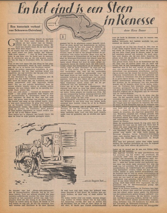 Gisteren, in de middag, bracht de veerboot mij van Goes naar Zierikzee. De zon scheen en het water van de OosterSchelde had een diep-blauwe kleur. Er stond een straffe wind, die de boot bij tijd en wijle flink deed deinen. In de kajuit was het warm. Op een bank voor het raam stond een klein meisje, dat telkens: "Kijk eens, pappie ... ", riep. Ik keek naar haar, maar ik zag haar niet. Ik dacht aan de mannen, die ik ontmoeten zou en die mij zouden vertellen van die dag in December 1944. Zo dommelde ik in. Toen er een tros tegen het dek sloeg en een paar kettingen rammelden, werd ik weer wakker. Ik zag, dat we in de haven van Zierikzee waren. Tussen de andere passagiers schuifelde ik over de loopplank. Bij een lege autobus stond een chauffeur, die mij vertelde, dat hij pas over twee uur naar Haamstede ging.